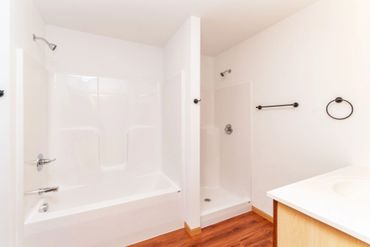 Each duplex has one bathroom. Some units have a combined tub and shower, others have a stand alone shower beside the tub.